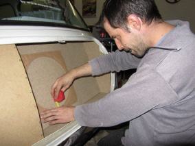(30.04.2011, Samstag) Nur noch 4 Tage bis Tuning World Bodensee Heute kam die Abdeckung für den Kofferraumdeckel an die Reihe. Auf der Suche nach dem passenden Material dafür, machten wir auch gleich eine interessante Entdeckung und zwar, daß man es in keinem Baumarkt findet ;) Wir waren echt in Jedem, doch die hatten alle nur 5 mm dicke MDF Platten und wie wir feststellen mussten, war es einfach unmöglich diese in die Wölbung des Deckels zu pressen.