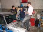 Nach diesem Testosteron Aufgebot *g* machten wir uns an die Feinschleifarbeiten (inkl. verkitten), um nach gründlicher Abdeckung unsere neue Schnauze mit Korrosionsschutz zu Grundieren.