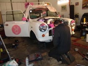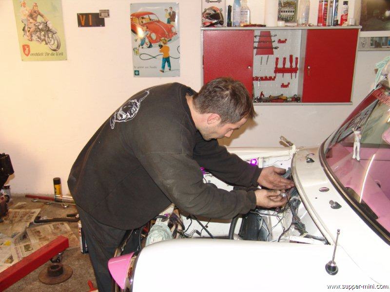 Das grosse Finish! Heute erfolgen die wirklich allerletzten Arbeiten am Mini, bevor es auf die weite Reise nach Dortmund zur Messe geht. Und Ihr könnt mir glauben, wenn ich Euch sage, daß wir nach diesem Marathonschrauben, momentan mindestens genauso „finish“ sind wie unser Mini (nur da hilft auch keine Politur mehr *g*)